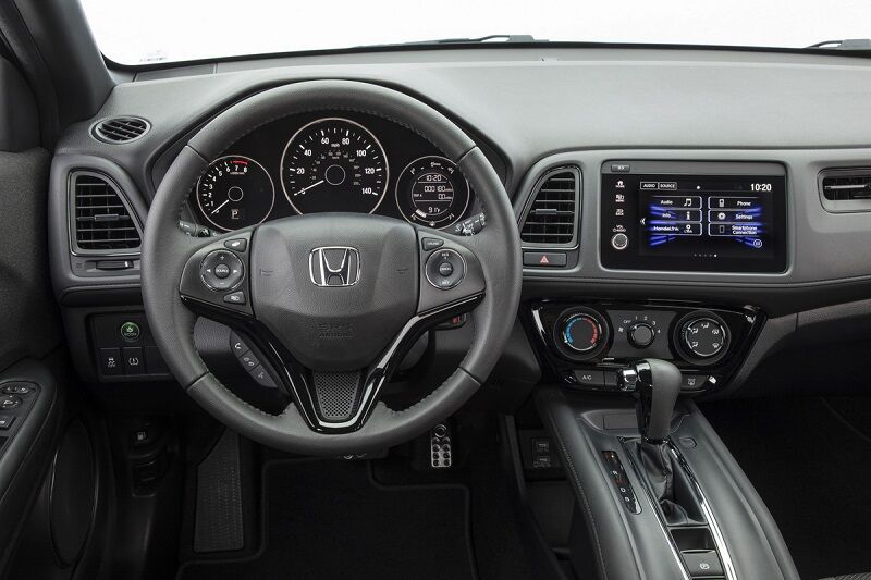 Standard on the LX base model and all other 2022 Honda HR-V trim levels, the 1.8-L engine block produces up to 141 horsepower. Limited to a redline level of 6,700 RPM, the I-4 powertrain cranks out 127 pound-feet of peak torque. Employing 16 SOHC valves with the trusted i-VTEC technology, this gasoline-burning powerplant offers excellent efficiency. The normally aspirated powerhouse works in tandem with a continuously variable transmission. You may choose the Sport Mode for this adaptive CVT system, which is fully compatible with the optional Real-Time AWD. Located on the left corner of the driver's side, the signature ECON button optimizes the performance of this efficient Honda crossover SUV. Inside the cabin, the 2022 HR-V LX trim packs a handful of convenient amenities, like the high-deck center console with a sliding armrest. An air conditioning system with an air filter and rear ducts is standard inside this entry-level model. You can completely fold the signature Magic Seat in the second row to maximize the cargo capacity. This base edition includes a 5-inch color LCD monitor with the Bluetooth HandsFreeLink technology and a four-speaker audio system. Parking this lightweight Honda crossover SUV will be easy when you look at the images from the standard Multi-Angle Rearview Camera. Some notable passive safety installations on this base trim include the SmartVent Front Side Air Bags, ACE body and side-curtain air bags with rollover sensors. Measuring 17 inches in diameter, the car's alloy wheels are painted in silver. Projector-beam halogen headlamps and LED brake lights are standard on this affordable Honda model.