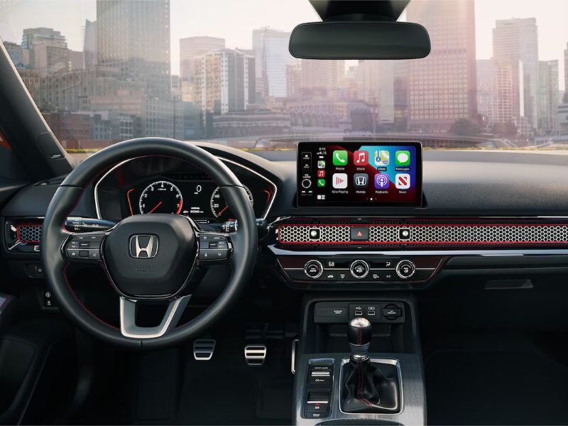 The interior of the 2024 Honda Civic SI in West Burlington is cozy and spacious with a ton of high-tech features. The sedan features leather-wrapped gear shift knob and steering wheel, as well as red-stitched stylish front seats. It also includes a range of cutting-edge technology features, such as Bluetooth connectivity, a 7-inch touchscreen audio system, and wireless Android Auto and Apple CarPlay compatibility. Not to forget a number of safety features, such as lane departure warning, adaptive cruise control, a rearview camera, and brake assist. With similar dimensions as the standard Honda Civic, it offers an equally comfy back seat and a trunk that can accommodate up to six carry-on suitcases. Headroom is also adequate and rear legroom is abundant.
