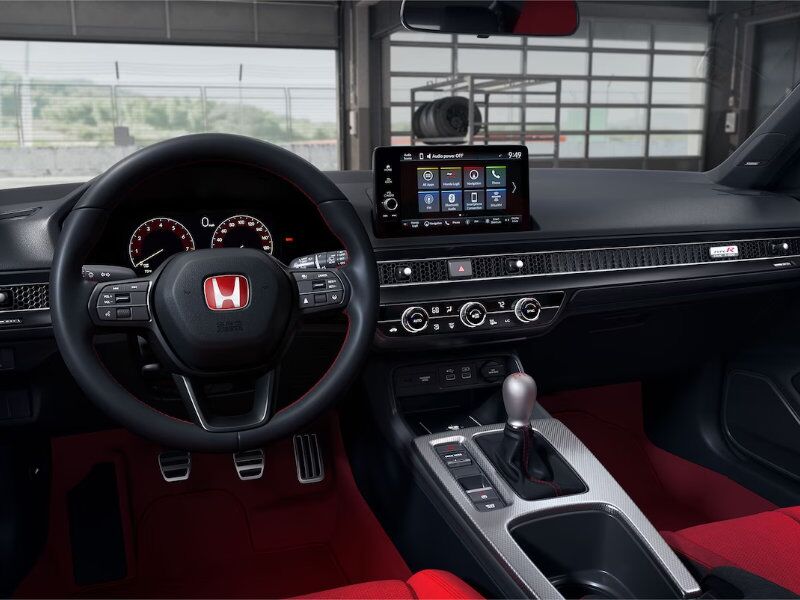 While the 2024 Honda Civic Type R cabin is designed to be sporty, it also has many features that enhance comfort. Drivers will enjoy comfortable sport pedals and an aluminum shift knob tailored to fit comfortable in the human hand, a leather-wrapped steering wheel, and dual-zone automatic climate control. Push-Button start is standard on the Civic Type R, and there are also some really cool features like illuminated red front door panels. Unlike many models in this class, the Civic Type R also picks up a sizable center console with a full storage compartment. This is very handy if you're buying this model as an everyday vehicle, too. Even better, the Type R seats four people, so there's room for a whole crew near Iowa City. As if driving a Type R isn't exciting enough, Honda also adds advanced technology to the interior during downtimes. Enjoy a 9-inch color touchscreen and a 12-speaker Bose premium sound system on your new Honda Civic Type R. Neat features like Speed-Sensitive Volume Control and HondaLink will also help you get more out of the Type R.