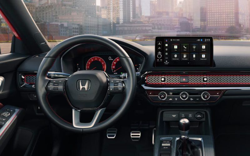 The interior of the 2025 Honda Civic Si Sedan is crafted for those who savor the finer things in life without sacrificing practicality. The cabin is adorned with premium materials and cutting-edge technology that ensure both driver and passengers experience the epitome of comfort and convenience. Soft-touch surfaces, available leather-wrapped steering wheels, and red-stitched sport seats elevate the interior's allure. The 9-inch Display Audio touchscreen provides easy access to navigation, audio controls, and smartphone integration through Apple CarPlay® and Android Auto™. Ambient lighting and a driver-focused cockpit layout offer an immersive driving experience. Furthermore, the advanced dual-zone automatic climate control ensures everyone on board stays comfortable, regardless of the temperature outside.